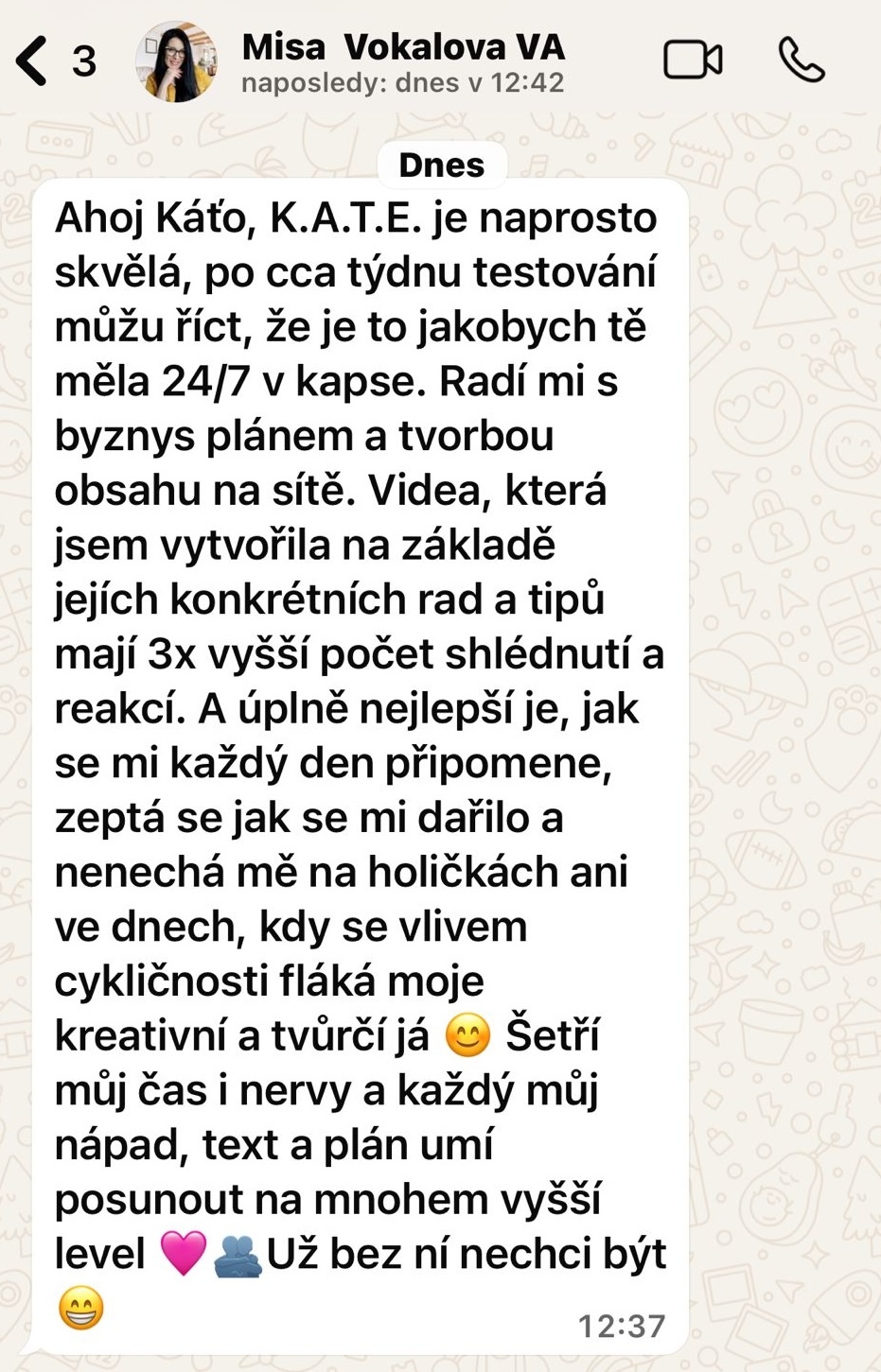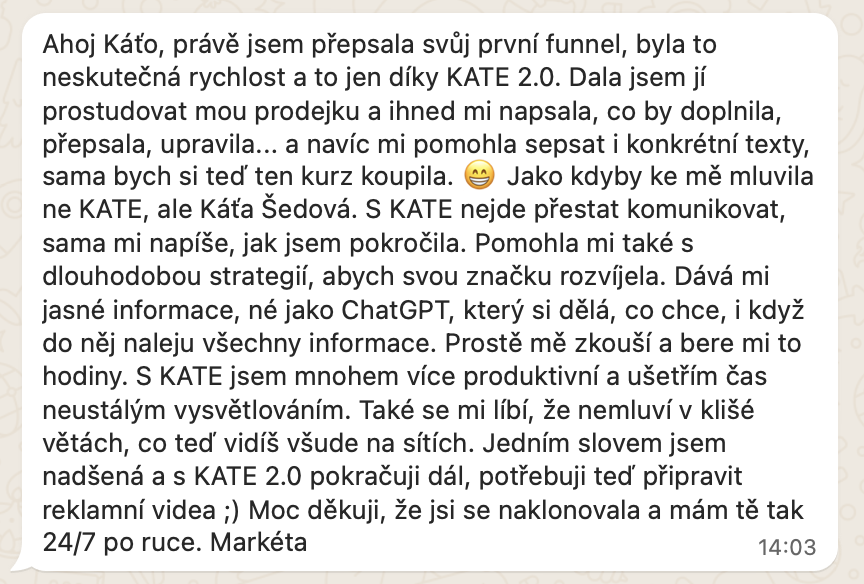 K.A.T.E. 2.0 jsem vytvořila, protože jsem viděla, jak mnoho podnikatelek trápí marketing a prodej. Chtěla jsem vytvořit nástroj, který by jim dal přístup ke všem strategiím a know-how, které jsem za dvě dekády nasbírala, a to v podobě, která je okamžitě použitelná a dostupná 24/7.